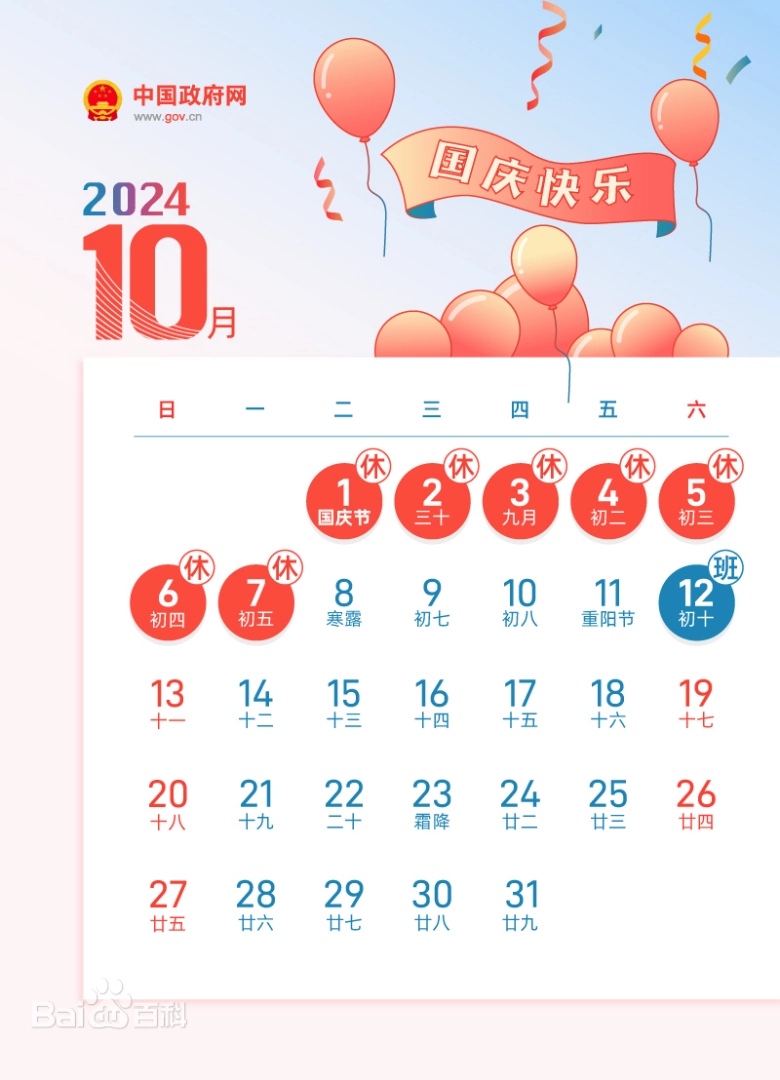 尊敬的用戶(hù)、各位同事:根據(jù)《國(guó)務(wù)院辦公廳關(guān)于2024年部分節(jié)假日安排的通知》(國(guó)辦發(fā)明電〔2023〕7號(hào))要求,2024年國(guó)慶節(jié)中心放假時(shí)間為2024年10月1日至10月7日放假,共7天。10月8日(星期二)、10月12日(星期六)正常上班。一、各部門(mén)自行妥善安排好放假前工作,9月30日下午下班前務(wù)必切斷水、電源,關(guān)好門(mén)窗做好安全防范工作。二、節(jié)日期間,技術(shù)人員需24小時(shí)保持手機(jī)開(kāi)機(jī)狀態(tài),已確保緊