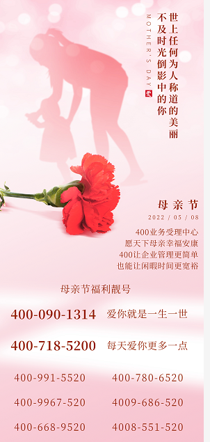 2022年5月8日 400電話優(yōu)質(zhì)號源加推 世上任何為人稱道的美麗,不及時光倒影中的你。400業(yè)務(wù)受理中心,愿天下母親幸福安康。母親節(jié)福利靚號:400-090-1314愛你就是一生一世400-718-5200每天愛你更多一點(diǎn)更多愛你靚號:400-991-5520400-9967-5204 優(yōu)惠活動 2022年05月08日 0 點(diǎn)贊 0 評論 1520 瀏覽