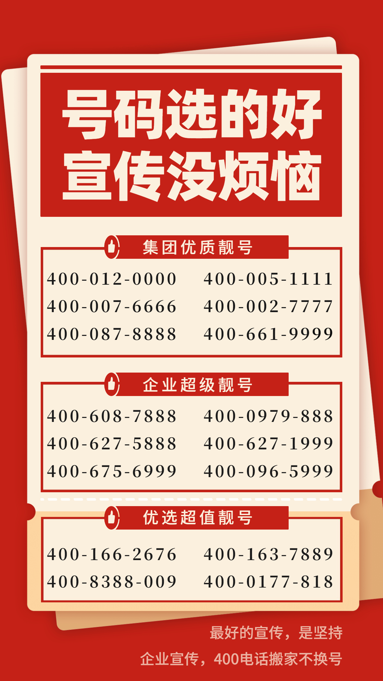 【開工大優(yōu)惠】400電話申請(qǐng)辦理企業(yè)400熱線優(yōu)質(zhì)號(hào)碼推薦 胡歌說不急,偷偷當(dāng)爸同行說不急,偷偷做廣告就你,當(dāng)真不急找我辦理400電話,一步搞定宣傳熱線今日優(yōu)選:400-007-6666400-090-8888400-078-9789400-000-6600集團(tuán)靚號(hào),活動(dòng)銷售價(jià)150000元/3年400 優(yōu)惠活動(dòng) 2023年02月03日 0 點(diǎn)贊 0 評(píng)論 1972 瀏覽