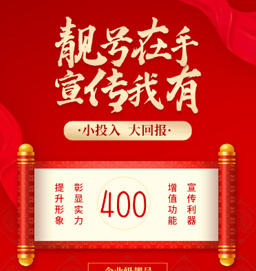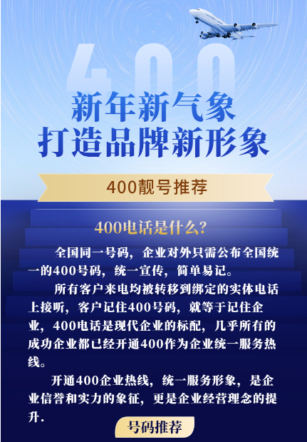 [開工優(yōu)惠]2023年1月31日 企業(yè)400電話申請(qǐng)辦理優(yōu)質(zhì)號(hào)碼推薦 日歷開始新的一頁,日子開始新的一天。400電話開啟企業(yè)宣傳新篇章今日推薦:400-081-8888400-069-8888400-679-8888400-696-8888400-079-8888400-697-8888集團(tuán)頂級(jí)靚號(hào),活動(dòng)銷售價(jià)1 優(yōu)惠活動(dòng) 2023年01月31日 0 點(diǎn)贊 0 評(píng)論 1959 瀏覽