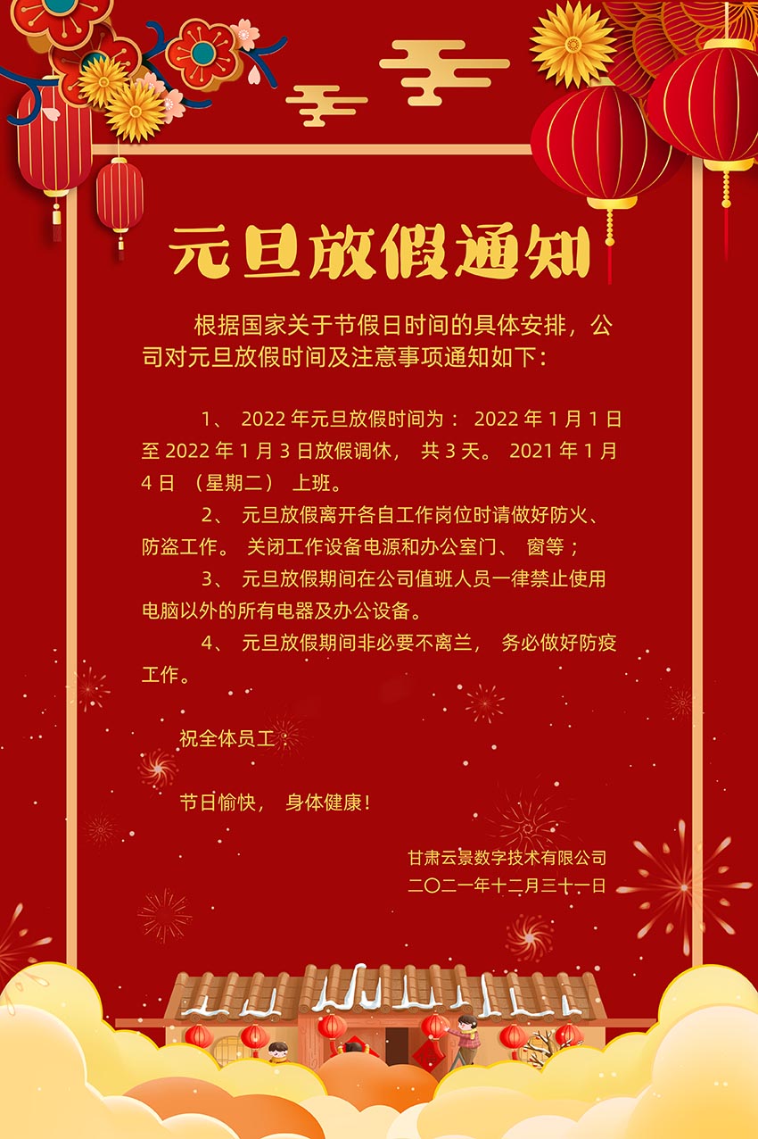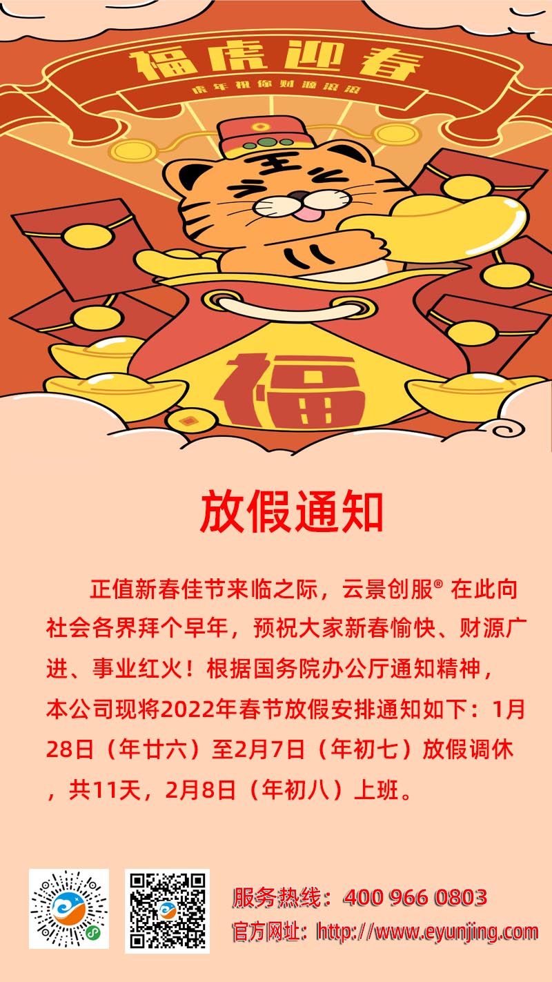 2022年春節(jié)放假通知來了,預(yù)祝大家新春愉快! 正值新春佳節(jié)來臨之際,云景創(chuàng)服®在此向社會各界拜個早年,預(yù)祝大家新春愉快、財源廣進、事業(yè)紅火!根據(jù)國務(wù)院辦公廳通知精神,本公司現(xiàn)將2022年春節(jié)放假安排通知如下:1月28日(年廿六)至2月7日(年初七)放假調(diào)休,共11天,2月8日(年初 公告通知 2022年01月27日 1 點贊 0 評論 3363 瀏覽