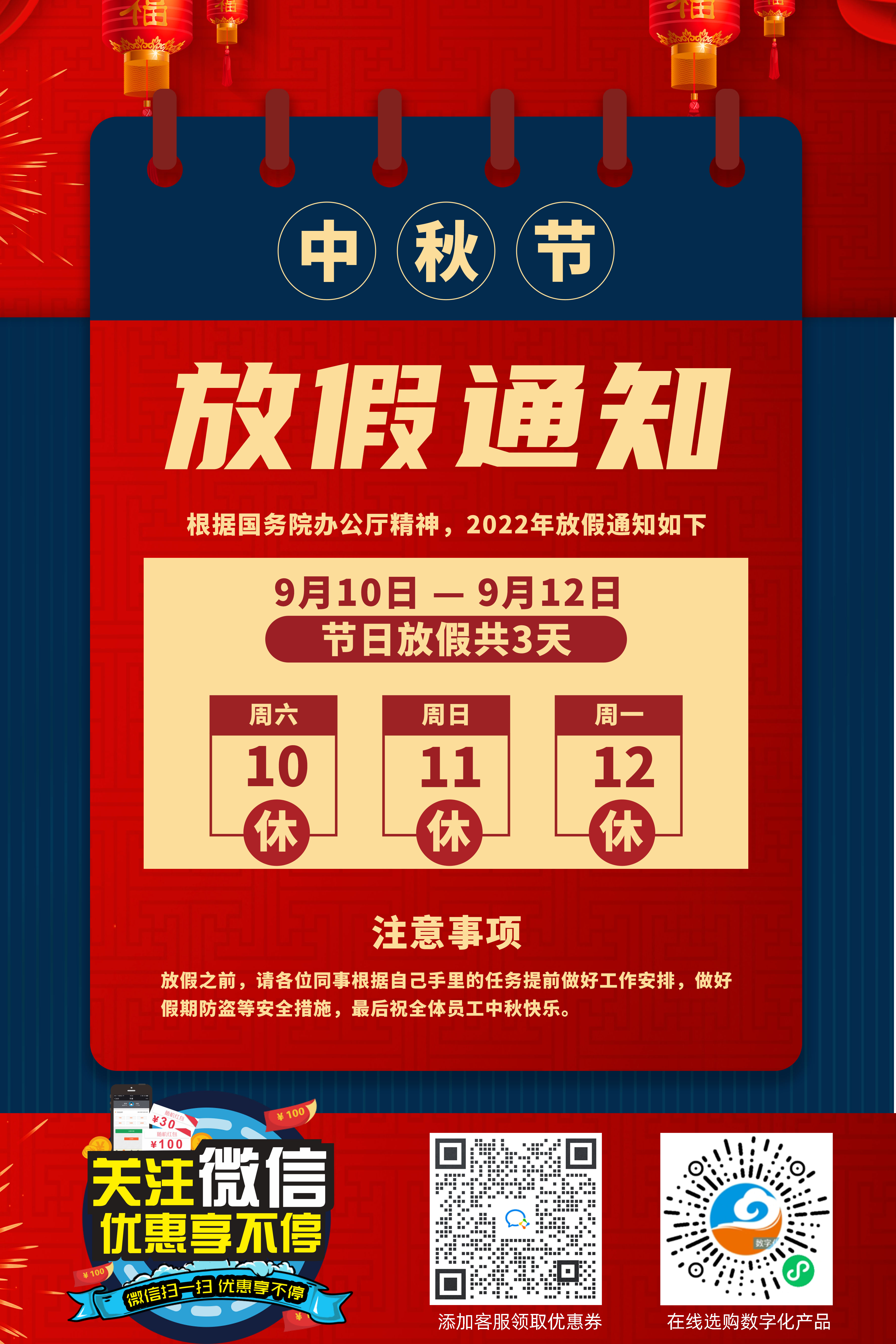 云景創(chuàng)服2022年中秋節(jié)放假公告 尊敬的用戶、各合作伙伴:根據(jù)《國務(wù)院辦公廳關(guān)于2022年部分節(jié)假日安排的通知》,并結(jié)合我公司實際工作需要,現(xiàn)將中秋節(jié)放假有關(guān)事宜通知如下:一、中秋節(jié):9月10日至9月12日放假調(diào)休,9月13日(星期二)照常上班,共3天。二、各部門自行妥善安排好 公告通知 2022年09月09日 1 點贊 0 評論 3089 瀏覽